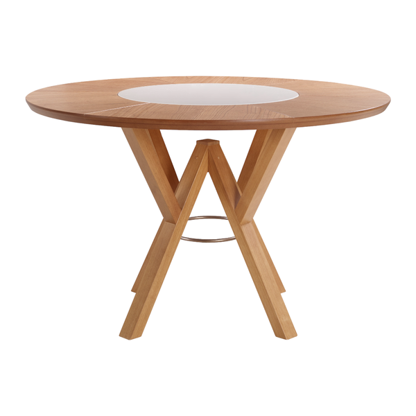 A mesa de jantar redonda Daisy combina sofisticação e funcionalidade com seus pés em madeira maciça de tauari e o tampo em MDF revestido com lâmina de cinamomo. Ao centro, um tampo de vidro giratório adiciona um toque de modernidade e praticidade, criando um design inovador que transforma qualquer ambiente.