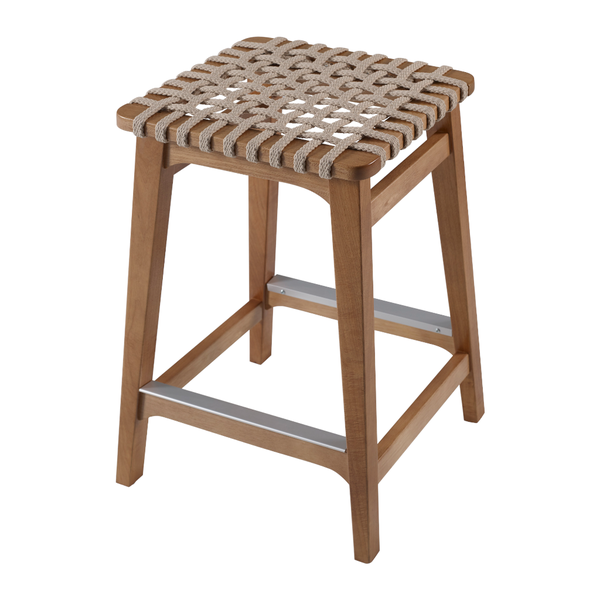 Ideal para Mesa Bistrô e Bancadas. Seu diferencial é o assento produzido de forma artesal com cordas náuticas. Banqueta linda e confortável. E no apoio de pés, possui uma proteção em alumínio para que não danifique a parte da madeira ao apoiar os pés.