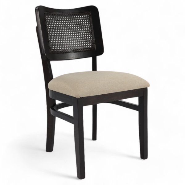 Cadeira Pinoli em Madeira Maciça e Assento Estofado. Produzido em madeira de Tauari, assento estofado e encosto com detalhes em tela sextavada. Uma opção de deixar sua sala de jantar mais elegante.