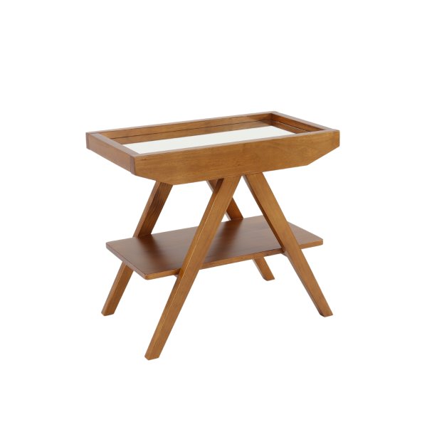 A Mesa de Apoio Modus é a síntese entre modernidade e elegância. Suas linhas diagonais marcantes e a combinação entre a madeira maciça e o tampo espelhado criam um visual contemporâneo e refinado. O espelho embutido não apenas valoriza a peça, como também reflete luz e sofisticação, destacando os objetos decorativos com charme e leveza.