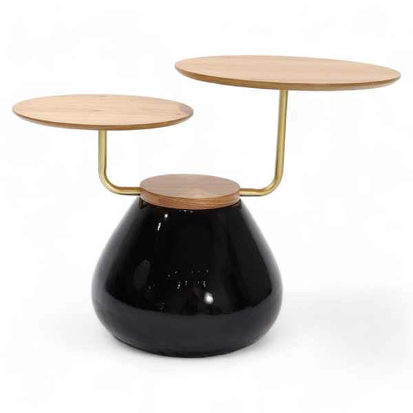Um produto que traz a classe, elegância e também moderna. Possuindo dois tampos com tamanhos diferentes (um de 40cm e outro de 50 cm), deixará seu ambiente muito lindo. Seus tampos são produzidos com lâmina de cinamomo, e sua base de material sintético e essa base ainda possui uma pintura automotiva. A peça que você estava esperando para colocar em sua decoração!