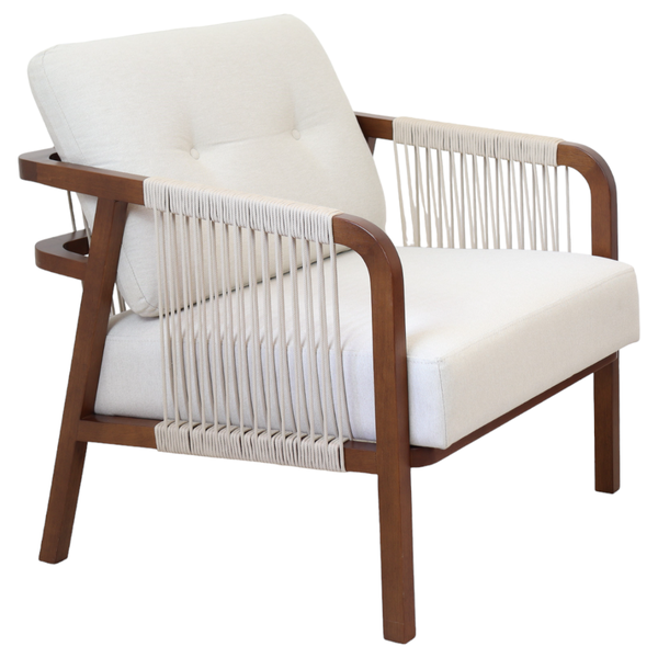 Poltrona Camenas é uma poltrona delicada e com um desing exclusivo. Possui nas laterais e encosto o detalhe das cordas no tom de areia dando um charme extra a peça. Uma peça produzida em madeira maciça de Tauari, uma madeira que provém de manejo sustentável. Possui assento e encosto estofado. Peça perfeita para seu ambiente.