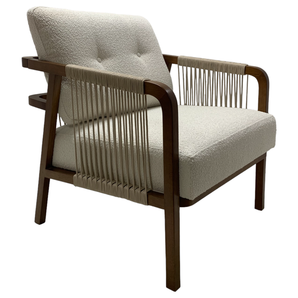 Poltrona Camenas é uma poltrona delicada e com um desing exclusivo. Possui nas laterais e encosto o detalhe das cordas no tom de areia dando um charme extra a peça. Uma peça produzida em madeira maciça de Tauari, uma madeira que provém de manejo sustentável. Possui assento e encosto estofado. Peça perfeita para seu ambiente.